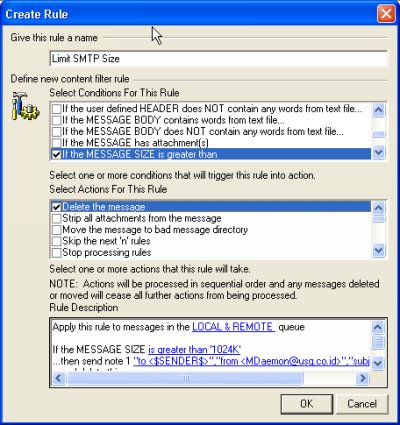 - Click the underlined blue link in the Rule Description for "is greater than '10K'" and type the maximum SMTP Size you want to use, then click Ok