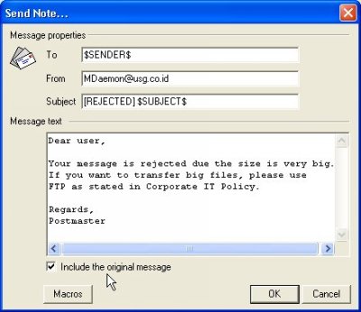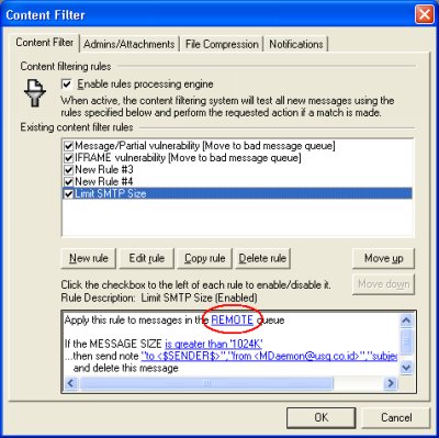 It seemed correct, whenever I tried to send a message with attachment larger than the size specified, MDaemon rejected it properly. Then I was confidently applied the configuration to the Primary Mail Server. After monitoring the log, I found out that MDaemon rejected the incoming messages larger than the size specified. Yikes !! Finally I knew that the setting covered both incoming and outgoing messages, I thought Alt+N should highlight the impact of some 'dangerous' settings, either in the Online Help or the application itself.