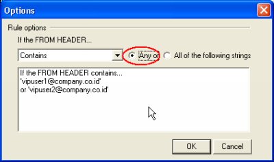 - Click the underlined blue link in the Rule Description for "contains specific strings" and type the e-mail address of the VIP users, click "Add" button. If you specify more than one e-mail address, then you have to change the logical connector from "AND" to "OR" by click the underlined blue link and select "Any", then click Ok.
