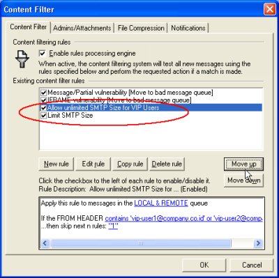 Since we configured to skip 1 rule if the messages were sent from VIP users, then we had to put this rule prior to the rule to delete large messages. The failure of doing this will make VIP users cannot send large messages.