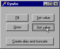 Button Grow memungkinkan Anda untuk mengubah ukuran array tanpa kehilangan isinya. Anda dapat memeriksanya dengan menggunakan button Get value setelah menekan button Grow: